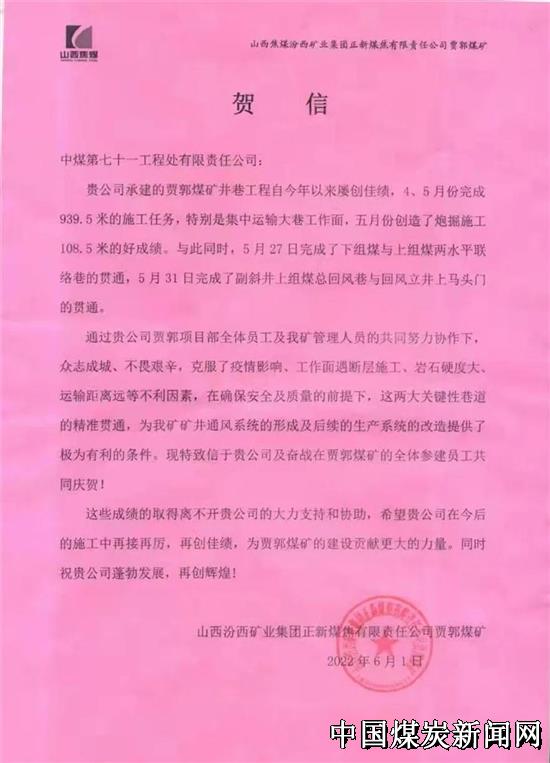 | 喜讯!中煤七十一处贾郭项目部喜获甲方贺信 | |||