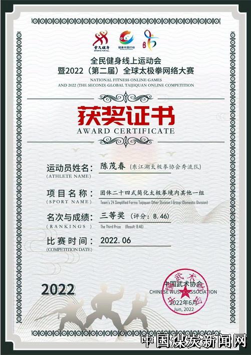 【本报讯】7月1日是个特别的日子,“全民健身线上运动会暨2022(第二届)全球太极拳网络大赛”经过一个月投票、评审和评比揭晓:湖南省煤业集团资兴矿区陈茂春、许永芳、聂和香、罗水平、曾亚进、郭成等15名职工和退休职工获得2022年全球太极大赛一等奖和三等奖。