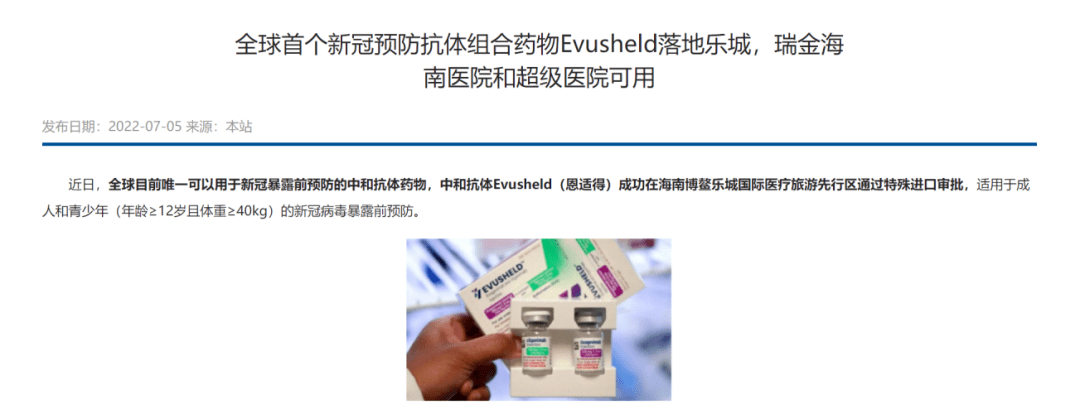 打两针,防新冠——对于特殊人群,这句标语具有多大的吸引力?博鳌超级医院和瑞金海南医院的咨询接线生最有体会。 近日,全球唯一一款可用于新冠病毒感染预防药物Evusheld(恩适得)在中国大陆首次先行先试准入的消息获得广泛关注。目前,恩适得尚未获得CDE(国家药品监督管理局药品审评中心)批准上市,根据“国九条”相关政策,恩适得仅可在乐城先行区使用。 据报道,恩适得价格为13300元,且不能使用医保结算。 可降低病毒进入和感染健康细胞的能力? 据海南博鳌乐城国际医疗旅游先行区网站文章介绍,Evusheld由两种全人源长效单克隆抗体替沙格韦单抗(Tixagevimab,AZD8895)和西加韦单抗(Cilgavimab,AZD1061)的抗体组成,可以模拟人体的天然抗体防御机制,通过与新冠病毒刺突蛋白上的不同位点结合,降低病毒进入和感染健康细胞的能力,并有助于清除已被感染的细胞。