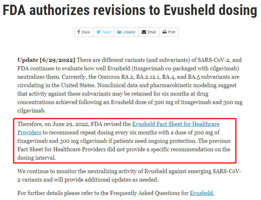 图片来源:海南博鳌乐城国际医疗旅游先行区网站截图 该抗体组合在欧洲部分国家获批使用,其PROVENTⅢ期试验于今年3月前达到主要终点。数据显示,与安慰剂相比,该抗体组合药物将有症状新冠感染的相对风险降低了77%,绝对风险减少了0.8%,用药后中位随访时间为83天;在随后的分析中,随访中位时间为6.5个月,与安慰剂相比,抗体组合药物将有症状新冠发病率的相对风险降低了83%,绝对风险减少了1.5%。 但值得注意的是,应对更迭不休的奥密克戎变体株,恩适得的效力需要靠加大剂量维持。 当地时间6月29日,FDA官网发布对恩适得剂量修订的公告,称非临床数据和药代动力学模型表明,恩适得的剂量改为300mg替沙格韦单抗和300mg西加韦单抗后,药物浓度对这些亚变体的活性可以保持6个月。