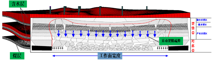 长距离隐蔽悬挂式半封闭截水帷幕示意图 中国煤科开采研究院基于覆岩采动裂隙垂向导水性差异分区特征和采动覆岩隔水特性,提出控水采煤理论与技术。他们通过控制不同分带进入含水层的扰动范围,控制矿井充水量,解决了水体下留设不同类型防水煤岩柱而造成煤炭资源的大量损失、对含水层过量疏放导致地下水位大幅度下降等矿区生态环境破坏问题,实现了“控水保安全,保水促生态”的双重目标。