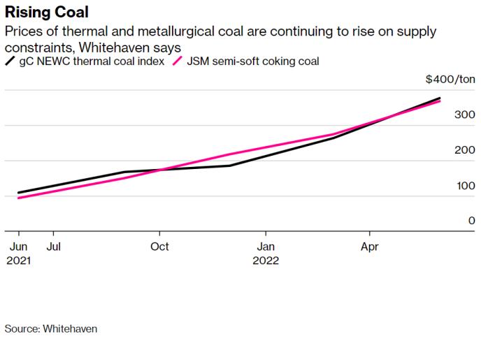 据澳大利亚一家主要生产商Whitehaven Coal Ltd.称,欧盟即将禁止进口俄罗斯煤炭,这将进一步增加供应压力,导致煤炭价格飙升至历史最高水平。 Whitehaven周一宣称,在全球供应限制和强劲需求推动下,亚洲基准纽卡斯尔动力煤在过去三个月内创下377美元/吨的季度纪录。该公司将在下个月公布财年业绩,市场预计其收益将从2.045亿澳元跃升至30亿澳元(20亿美元)。 总部位于悉尼的Whitehaven在声明中表示,将于下月生效的欧洲禁令“预计将会进一步收紧高质量动力煤的供应”。 “我们继续预测2022年至2023年,动力煤价格稳中有升。” ![]() 除了欧洲,日本和七国集团(G7)其他成员国也承诺,最早将于今年对俄罗斯的采购增加限制。这给全球市场带来了更大的压力,而与此同时,对煤炭的需求正在激增,整个能源行业供应紧张。 Whitehaven称,东北亚煤炭消费者正寻求在夏季之前补充库存,而包括欧洲在内的澳大利亚煤炭非传统买家的需求量也在加大。 据俄罗斯卫星通讯社当地时间18日报道,波兰总理莫拉维茨基承认,波兰近期将遭遇煤炭短缺的问题。在这种情况下,波兰气候和环境部取消了对供暖用煤质量的要求。波兰煤电占比约70%,为欧盟国家中最高。同时,三分之一的波兰家庭用煤取暖。 波兰4月禁止进口俄罗斯煤炭,随之出现煤炭短缺和价格飙升。近日,波兰政府宣布推出面向普通家庭的煤炭补贴政策,并从哥伦比亚、澳大利亚和南非等国进口煤炭,以弥补因禁止进口俄煤炭而造成的800万吨以上煤炭的缺口。