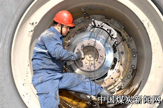 图为该中心职工正在检修卡车制动系统