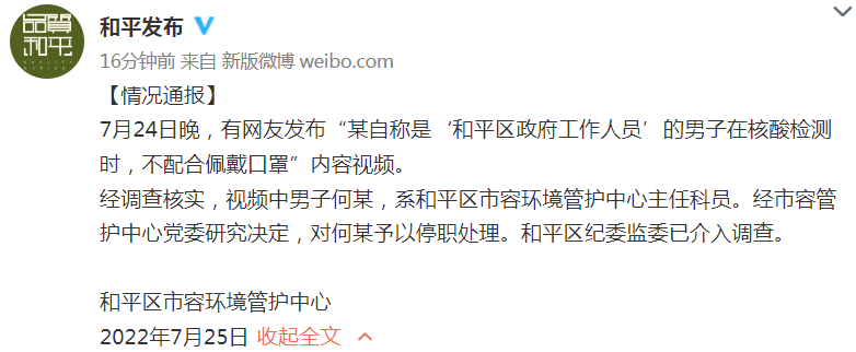 7月24日晚,有网友发布“某自称是‘和平区政府工作人员’的男子在核酸检测时,不配合佩戴口罩”内容视频。