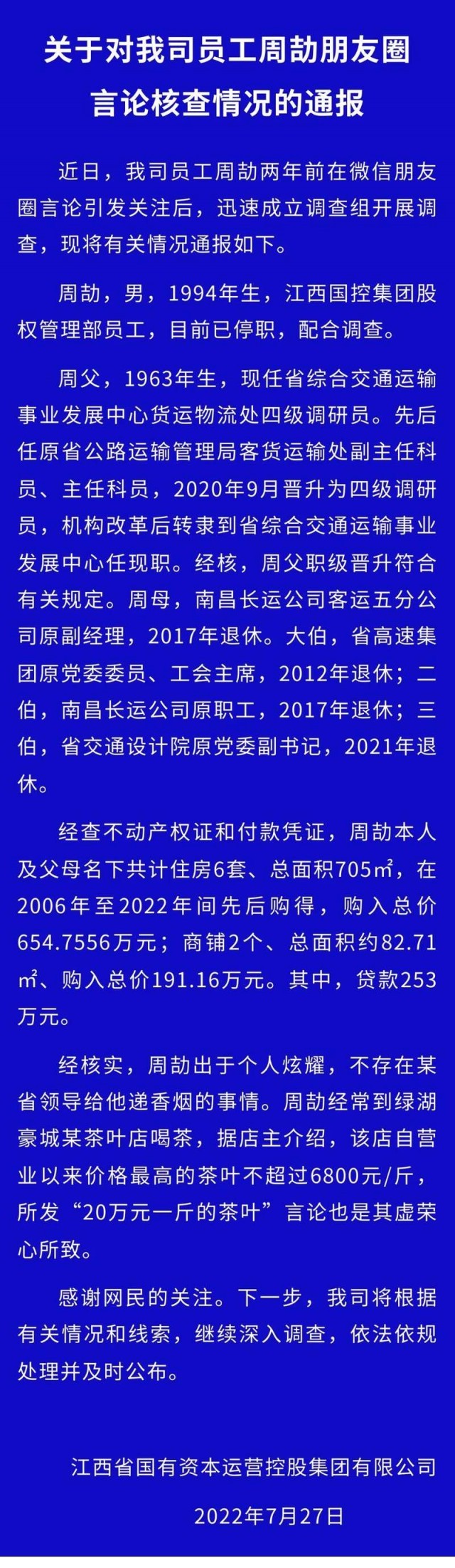 中国青年报客户端南昌7月27日电(中青报·中青网记者 陈卓琼)今日凌晨,江西省国有资本运营控股集团有限公司(以下简称“江西国控”)就员工朋友圈“炫富秀权”一事再次通报称:该名员工已停职,配合调查;不存在某省领导给他递香烟的事;其父职级晋升符合有关规定;其母、大伯、二伯、三伯退休前均任职于交通系统。