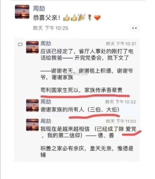 截图显示,出现在周劼朋友圈的人物不是政府官员,就是企业高管。此外,周劼还在朋友圈宣称父亲升任副局长,感谢大伯、三伯,并提及办公室主任怕自己冷,让工人加装挡风板等炫父、炫背景的内容,多次暗示自己有强大背景和后台。 网友纷纷呼吁彻查周劼背后的权力网,捍卫社会公平底线。 江西国控7月27日通报称,周父现任江西省综合交通运输事业发展中心货运物流处四级调研员,而非周劼宣称的副局长。经核,周父职级晋升符合有关规定。 该通报还透露,周母、大伯、二伯、三伯此前均在交通系统任职:周母为南昌长运公司客运五分公司原副经理,大伯为省高速集团原党委委员、工会主席,二伯为南昌长运公司原职工,三伯曾任省交通设计院党委副书记。目前,这几人均已退休。