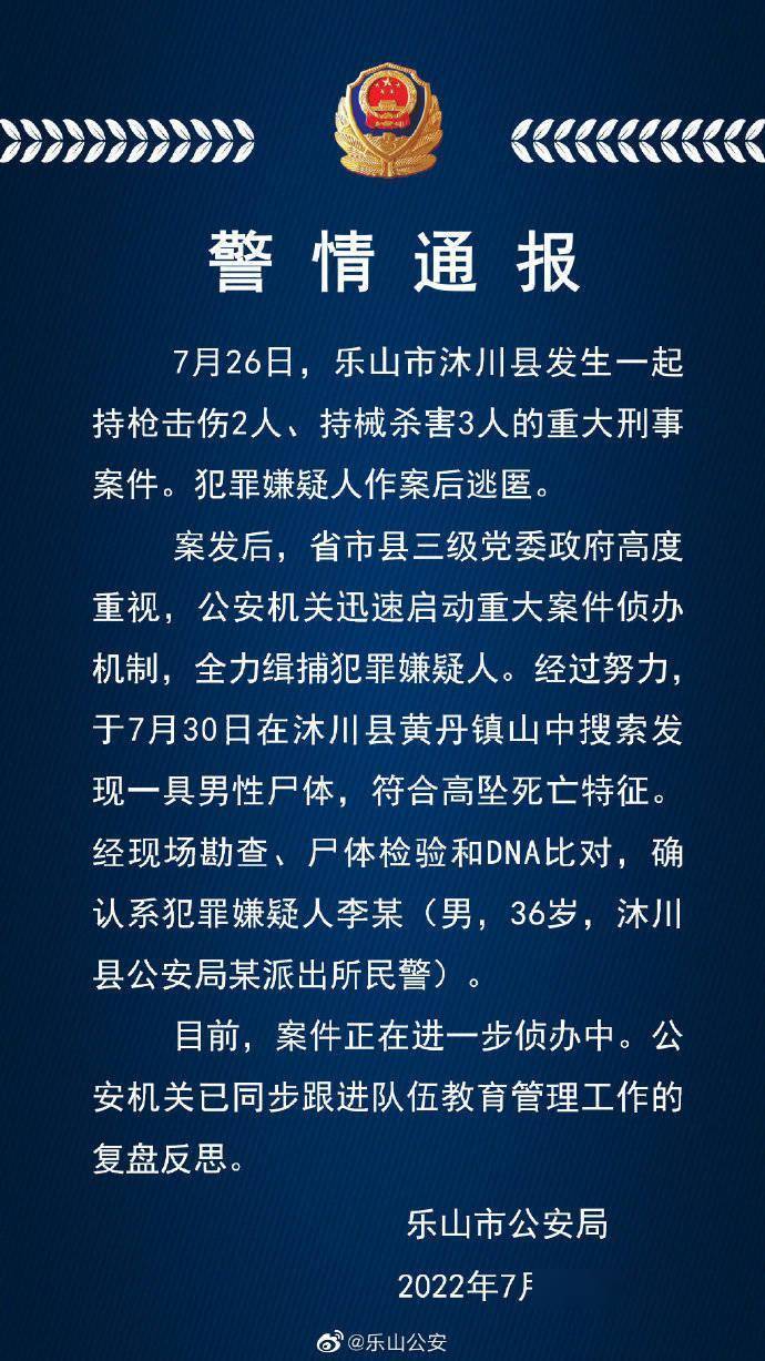 据四川乐山市公安局7月30日通报,7月26日,乐山市沐川县发生一起持枪击伤2人、持械杀害3人的重大刑事案件。犯罪嫌疑人作案后逃匿。 案发后,公安机关迅速启动重大案件侦办机制,全力缉捕犯罪嫌疑人。经过努力,于7月30日在沐川县黄丹镇山中搜索发现一具男性尸体,符合高坠死亡特征。经现场勘查、尸体检验和DNA比对,确认系犯罪嫌疑人李某(男,36岁,沐川县公安局某派出所民警)。 目前,案件正在进一步侦办中。公安机关已同步跟进队伍教育管理工作的复盘反思。