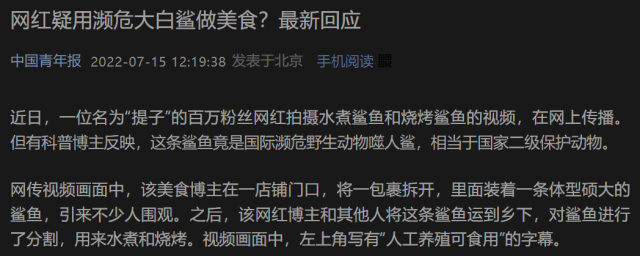 7月14日,一位名叫“提子”的美食网红博主拍摄水煮鲨鱼和烧烤鲨鱼的视频火爆网络,有科普博主反映,这条鲨鱼是国际濒危野生动物噬人鲨,相当于国家二级保护动物,“网红疑用濒危大白鲨做美食”迅速冲上热搜。 7月31日,封面新闻记者从南充警方获悉,经鉴定,网红“提子”视频中的鲨鱼确是噬人鲨(也称大白鲨),相关案件正在进一步办理中。