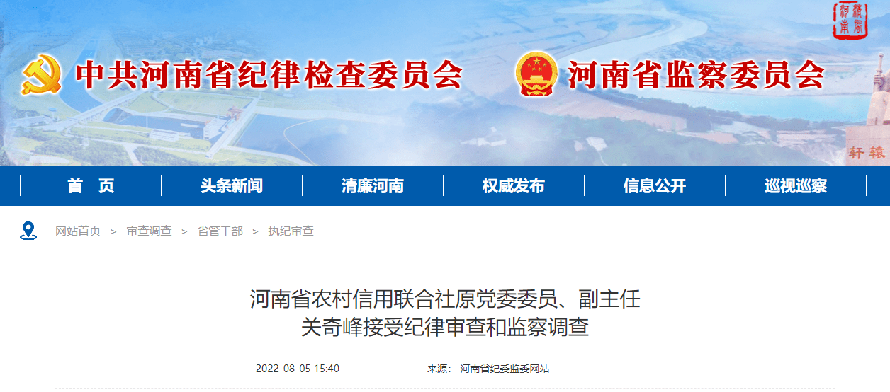 简历显示,关奇峰于1959年10月出生,今年63岁,是河南柘城人,1976年12月参加工作,长时间在河南金融机构任职。曾担任过农业银行焦作分行副行长,农业银行河南省分行科技中心副总经理、分行副行长,后历任中国农业发展银行信息电脑部综合规划处正处级干部,信息技术部综合处正处级干部、处长,信息技术部副总经理等。2009年6月,关奇峰成为河南省农村信用联合社党委委员、副主任,2020年6月卸任。 同日接受调查的王献军,出生于1963年,是河南平舆人,1981年9月参加工作,长期在金融监管系统工作。曾担任过原银监会周口监管分局党委书记、局长,原银监会驻马店监管分局党委书记、局长,银保监会信阳监管分局党委书记、局长、一级调研员、二级巡视员等职务。 此外,7月下旬,河南已有4名金融官员相继被查,分别是银保监会河南监管局一级巡视员李焕亭(7月24日被查),央行郑州中心支行金融稳定处处长赵德旺(7月29日被查),银保监会开封监管分局党委书记、局长夏军(7月29日),银保监会河南监管局非银二处处长、一级调研员郭琴(7月29日被查)。 今年4月以来,河南村镇银行取款难事件引发多方关注,目前,河南村镇银行即将开始第四批资金垫付工作。 8月5日,河南银保监局、河南省地方金融监管局发布公告称,按照垫付工作安排,自2022年8月8日上午9时起,对禹州新民生村镇银行、上蔡惠民村镇银行、柘城黄淮村镇银行、开封新东方村镇银行账外业务客户本金单家机构单人合并金额15万元至25万元(含)的开始垫付,15万元(含)以下的继续垫付。 每日经济新闻综合自中国银保监会、河南省纪委监委网站、每经网