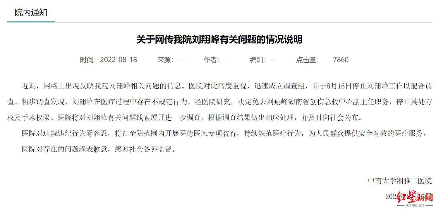 针对多位网友反映中南大学湘雅二医院医生刘翔峰存在医疗作风问题,8月18日下午,湘雅二医院发布通报称,初查刘翔峰在医疗过程中存在不规范行为,已对其停职并免去相应职务,正展开进一步调查。