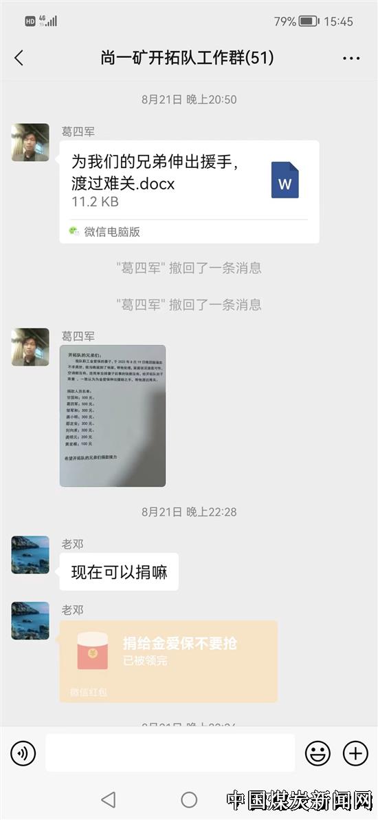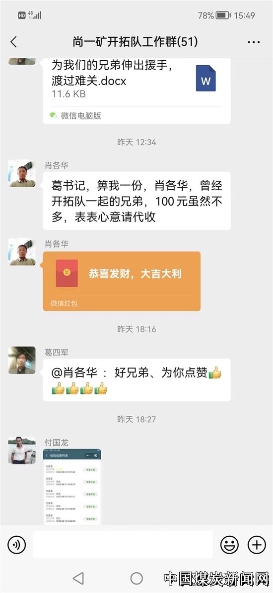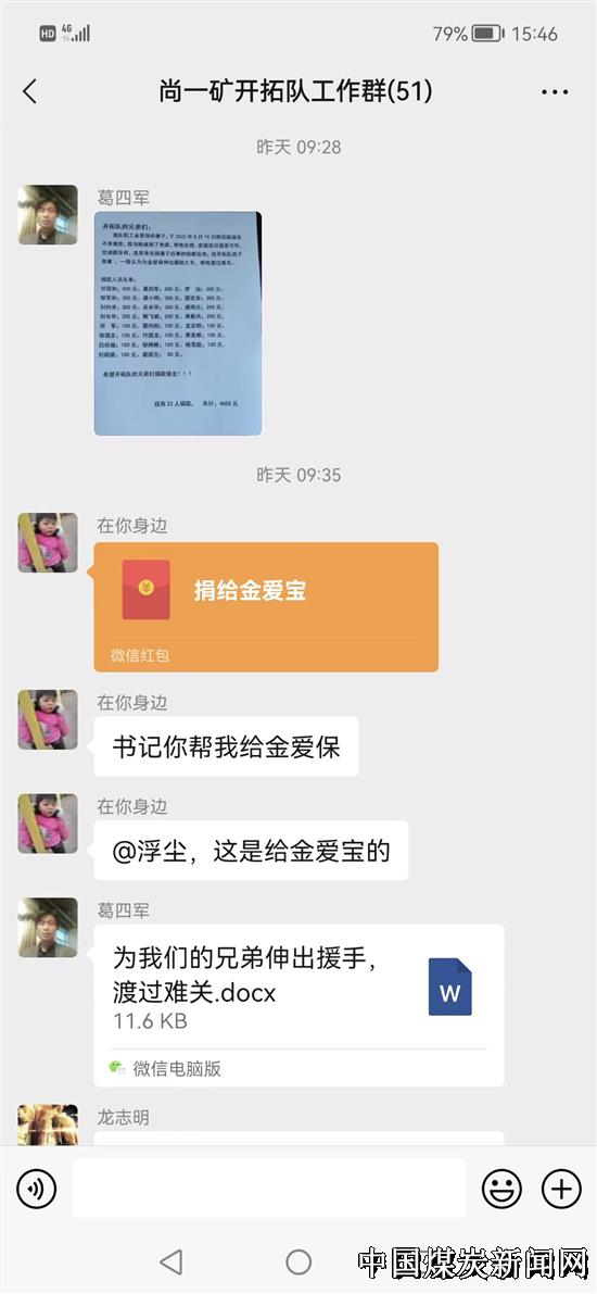 “我队职工金爱保的妻子突发脑溢血不幸离世。大家知道爱保家里很困难,希望大家伸出援助之手,帮他渡过难关,希望兄弟们捐款接龙!” 8月21日一大早,在江西安源煤业集团尚庄煤矿开拓队工作群里,该队支部书记葛四军突然弹出这么一段话,而且这段话的后面附有区队党员干部捐款的明细表,随后,立刻引发了该队职工的关注。 ![]() “现在可以捐吗?” 看到微信群里的捐款接龙,有性急的工友立马问道,随后就将红包上传了上来。 一看有人带头,捐款的红包就接二连三地发出来了。 搞笑的是,工友龙志明登录区队微信较晚,没有看到葛四军发布的捐款信息,点开手机工作群,发现有人发红包,想也不想,手快的他上去就点开一个红包。 等到有工友提示后,龙志明自己闹了一个大红脸,心虚的他,赶紧补救,也响应号召,上传一个红包,并在红包上注明:“捐给金爱保”,以防有人向他学习。 ![]() “葛书记,算我一份,肖各华,曾经开拓队一起的兄弟,100元虽然不多,表表心意请代收。”已经离职半年多的工友肖各华,看到捐款信息后,也毫不犹豫发来一份爱心。 “肖各华,好兄弟,为你点赞!”一时之间,很多工友纷纷为肖各华的行为点赞。 爱心会传染,因疫情隔离在家,没有上班的职工、借调在外单位上班的职工、甚至还有因病在住院的职工也纷纷慷慨解囊,向金爱保伸出关爱之手,通过微信群,你200元、我100元,捐款金额很快就达到7100元,开拓队全队共有42人,没有一个人落下,爱心满满的。 疫情虽然让人产生距离,但人间自有真情在,挡不住工友们浓浓的关爱之心。 ![]()