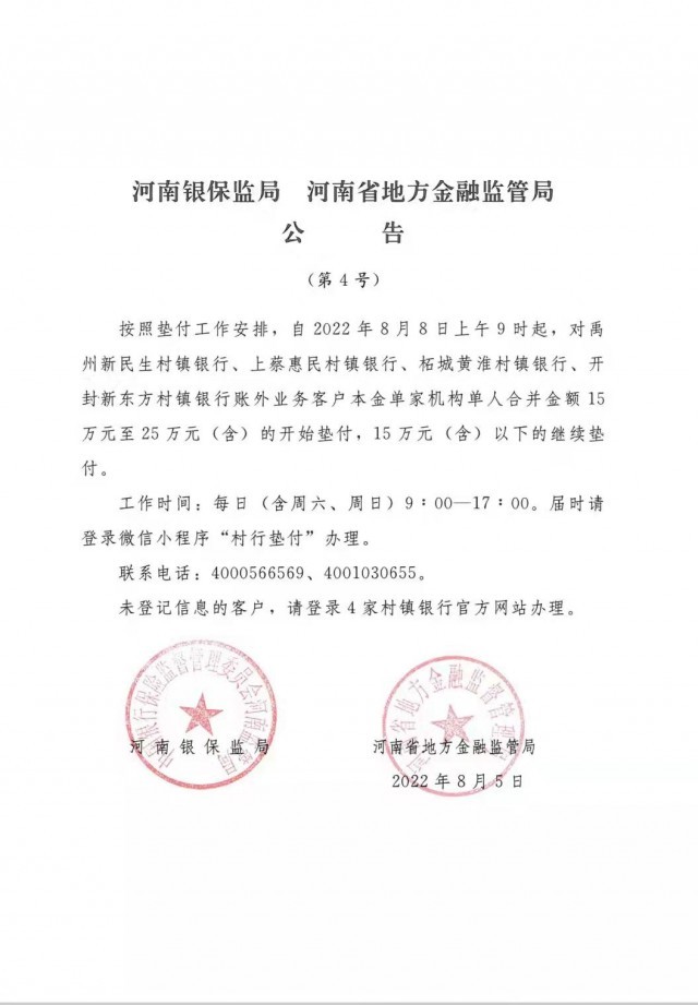 河南:对4家村镇银行客户单人金额15万-25万的开始垫付
