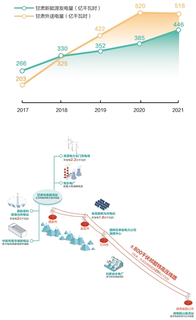以上发电量为2021年数据 数据来源:国网甘肃省电力公司 能源是经济社会发展的重要物质基础。7月28日召开的中共中央政治局会议指出,提升能源资源供应保障能力,加大力度规划建设新能源供给消纳体系。 以大型风光电基地为基础、以其周边清洁高效先进节能的煤电为支撑、以稳定安全可靠的特高压输变电线路为载体的新能源供给消纳体系要怎么建?如何实现供给端的多能互补?新能源出力有间歇性、波动性、随机性等问题,如何解决“看天吃饭”难题?如何防止弃风、弃光,有效提升新能源消纳和存储能力?记者以甘肃的实践为样本进行了深度调研。 ——编 者 8月的河西走廊,阳光炽烈,西风漫卷。 记者从甘肃兰州出发,沿着连霍高速、武金高速驶向西北,成片的光伏板、高耸的风机目不暇接。 作为新能源开发大省,甘肃的风能技术开发量为5.6亿千瓦,位居全国第四;光伏发电技术开发量为95亿千瓦,排名全国第五。优越的资源禀赋之下,如何有序开发利用、建设新能源供给消纳体系?记者沿着甘肃境内的祁韶特高压输电线路一路走访,寻找答案。 新能源从哪儿来? 追光捕风,多能互补 盛夏午后,烈日当空。位于巴丹吉林沙漠南缘的金昌市东大滩,像个燃烧正旺的火炉,烤得人皮肤生疼。 抬眼望去,数不清的光伏板在阳光照耀下更显蔚蓝,仿佛镶嵌在白茫茫戈壁滩上的一片湖泊。这里,是金昌振新光伏发电有限公司东大滩100兆瓦光伏电站。 “这些可不是普通的光伏板,是会转的。”电站生产管理工程师王成虎如数家珍,“有了它们,发电量能比同规模固定式电站提高近25%。” 记者饶有兴致地上前观察,王成虎继续介绍:“光伏板通过两块感光板实现东西向的对日跟踪,自动识别太阳照射角度,然后随之旋转,实现发电效率最大化。” 蹲下细看,在光伏板下还有成片的骆驼刺。“光伏板遮挡了部分阳光,这也带来了意外之喜——电站区域的植被较周边戈壁滩多出10%。”王成虎说,更显著的是经济效益——这座电站产生的绿电全部上网,去年发电量创历史新高,达1.8亿千瓦时。 “太阳落山了岂不是没法发电了?”从光伏电站出来,记者问。 “别着急,明天要去的光热电站正好能解答你的疑惑。”同行的国网甘肃省电力公司工作人员唐新山说。 第二天一早,从金昌出发,驱车800多公里,还没进入敦煌光电产业园,远远就看到一座巍峨挺立的吸热塔。 走进场区,宛若置身科幻世界:以这座260米高的吸热塔为圆心,1.2万块定日镜逐层散开,像向日葵上按层排列的一粒粒种子,其中最远的一层距离塔心1.5公里。 “这些定日镜,每块面积为100多平方米。”首航高科敦煌100兆瓦熔盐塔式光热电站总经理刘福国说,“塔上的两个储盐罐里有3万吨熔盐,可储热11小时,连续24小时发电。我们这座电站与一般光伏电站最大的区别,就是通过熔盐储存热能,实现昼夜均能发电。发的电不仅可以直接上网,还可以储备下来参与调峰调频。” 作为亚洲第一座熔盐塔式光热电站,自2018年底并网以来,电站2021年发电量突破2亿千瓦时,今年预计达2.2亿至2.4亿千瓦时。 离开光热电站时,西风渐起。自电站东行280多公里,便来到玉门市玉门镇三十里井子。虽然已近20时,这里的太阳仍未落山。 夕阳下,155台风机环抱之中,甘肃龙源风力发电有限公司玉门风电场的控制室里,副场长任乐文正目不转睛地盯着电脑上的主接线图,监测风机转速、功率,以及风向、风速等数据。 “截至去年底,公司总装机容量为172.78万千瓦。”任乐文说,电场去年发电量达2.2亿千瓦时,达历史最高水平。 像这样的电站、电场,甘肃还有不少。追光捕风,多能互补,一路走一路看,当地的新能源供给结构愈发清晰。 截至今年6月底,甘肃新能源装机容量达3200万千瓦。“1至6月,新能源发电量达到260亿千瓦时,同比增长16.8%。”国网甘肃省电力公司发展事业部副总经理付兵彬告诉记者。 光照少风力小时,新能源出力受限怎么办? 增加火电水电出力,调用储能,多元调峰保障大电网运行 “超短期预测显示,风速将上升至每秒10米,现场实测风速怎么样?” “每秒只有2米左右,达不到风机启动条件。” 去年3月23日傍晚,国网甘肃省电力公司调度中心迎来一场“遭遇战”:17时开始,甘肃风电出力偏离超短期预测,开始下降;河西地区各风电场站预测总出力579万千瓦,实际仅有52万千瓦。发电锐减,不仅无法满足省内晚高峰用电,还将减少祁韶特高压线路送电量。 调度员随即联络刘家峡水电厂、金昌电厂等省内水电站机组、火电厂加大出力。 17时20分,通过双边交易,购入陕西、宁夏、青海三地电力共230万千瓦。 17时30分,国网甘肃省电力公司调度中心申请国网西北分部调度控制中心调减直流外送100万千瓦,国家电力调度控制中心协调国网华中分部调度控制中心和国网湖南省电力公司调度中心,同时争取华中其他省份的电力支援。 20时,甘肃水火电出力已加至最大。 “在各方全力支援下,甘肃电网顺利度过晚高峰。”国网甘肃省电力公司调度中心副主任杨春祥说,“调度中心是电网的神经中枢,调度员必须对电厂的特性、结构非常清楚,才能及时调整应对。” 新能源出力有间歇性、波动性、随机性等问题,如何解决“看天吃饭”难题? 从实践来看,在新能源出力波动时,调度员会进行多元调峰,采取调整水火电机组出力、调用储能等措施,保障大电网安全稳定运行。 火电机