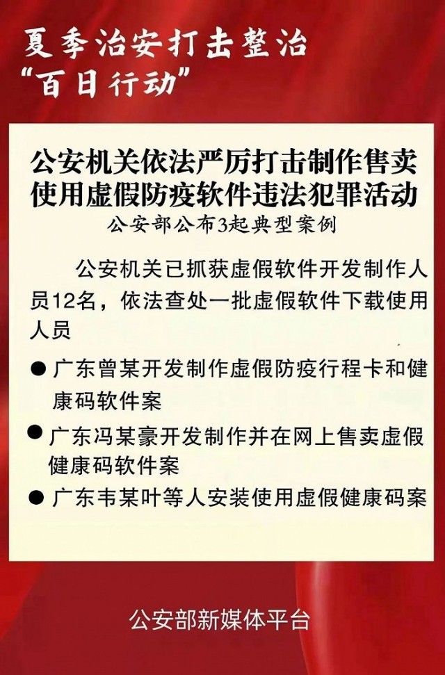 据公安部头条号8月8日消息,近日,在全国公安机关夏季治安打击整治“百日行动”中,公安网安部门果断出击、迅速侦破一批开发制作、发布售卖、下载使用虚假防疫软件案件,及时消除相关涉疫风险隐患。公安部今日公布3起典型案例。 针对近期网上涉疫违法犯罪活动情况,公安部网安局高度重视,部署广东等地公安机关依法深入开展侦查,发现个别违法犯罪嫌疑人在互联网上开发制作、发布售卖虚假防疫“大数据行程卡”和“健康码”等软件,帮助他人伪造涉疫证明信息,并在山寨仿冒的健康码页面进行显示,以此蒙骗防疫工作人员查验,严重干扰疫情防控秩序。目前,公安机关已抓获虚假软件开发制作人员12名,依法查处一批虚假软件下载使用人员。 公安部网安局有关负责人表示,公安机关将深入推进夏季治安打击整治“百日行动”,始终保持对各类网上涉疫违法犯罪活动的严打高压态势,坚决维护疫情防控秩序和人民群众生命健康。公安机关提示,开发制作、发布售卖、下载使用虚假涉疫软件,不仅严重干扰破坏疫情防控正常秩序,而且涉嫌违法犯罪,请广大群众提高防范意识自觉抵制违法犯罪行为,共同维护疫情防控秩序。 公安机关依法严厉打击开发制作、发布售卖、下载使用虚假防疫软件违法犯罪典型案例: 案例1:广东曾某飞开发制作虚假防疫行程卡和健康码软件案 年7月,广东公安机关侦破一起开发制作虚假防疫行程卡和健康码软件案件,抓获软件制作者曾某飞,依法查处软件购买使用人员100余名。经查,曾某飞为逃避核酸检测限制、炫耀计算机技术,开发制作了上述虚假防疫行程卡和健康码软件,并发布到互联网平台供他人下载,严重干扰新冠肺炎疫情防控工作。目前,公安机关已对曾某飞依法立案侦查并采取刑事强制措施,案件正在进一步侦办中。 案例2:广东冯某豪开发制作并在网上售卖虚假健康码软件案 年6月,广东公安机关侦破一起开发制作并在网上售卖虚假健康码软件案,抓获软件制作者冯某豪,依法查处软件购买使用人员20余名。经查,冯某豪为牟取非法利益,开发制作虚假健康码软件,并上传至互联网平台公开售卖,严重干扰新冠肺炎疫情防控工作。目前,公安机关已对冯某豪依法立案侦查并采取刑事强制措施,案件正在进一步侦办中。 案例3:广东韦某叶等人安装使用虚假健康码案 年6月,广东公安机关侦破一起安装使用虚假健康码APP程序伪造健康码案,抓获安装使用人员韦某叶、温某辉。经查,韦某叶、温某辉从互联网平台获取虚假健康码APP程序并在手机安装使用,篡改行程卡信息,扰乱新冠肺炎疫情防控秩序。目前,公安机关已对韦某叶、温某辉依法处以行政警告处罚。