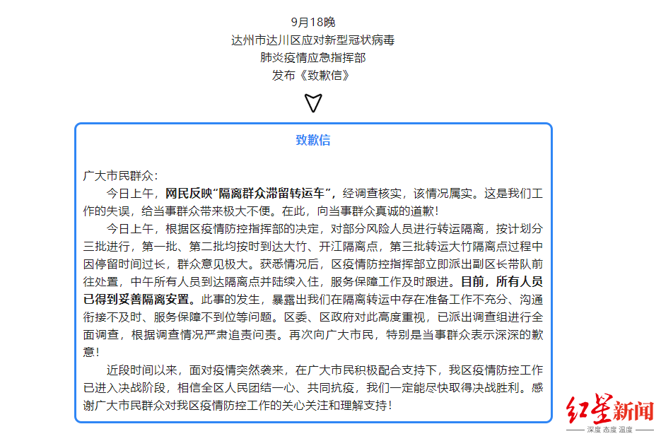 | 达州市达川区发布致歉信:网民反映“隔离群众滞留转运车”,经调查核实情况属实 | |||