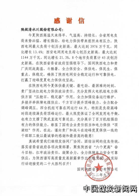 | 清水川能源公司收到国网陕西省电力有限公司感谢信 | |||