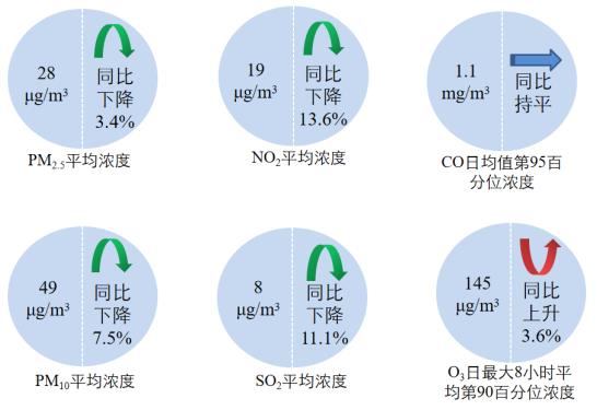 ![]() 图2 2022年1—8月全国339个地级及以上城市六项指标浓度及同比变化