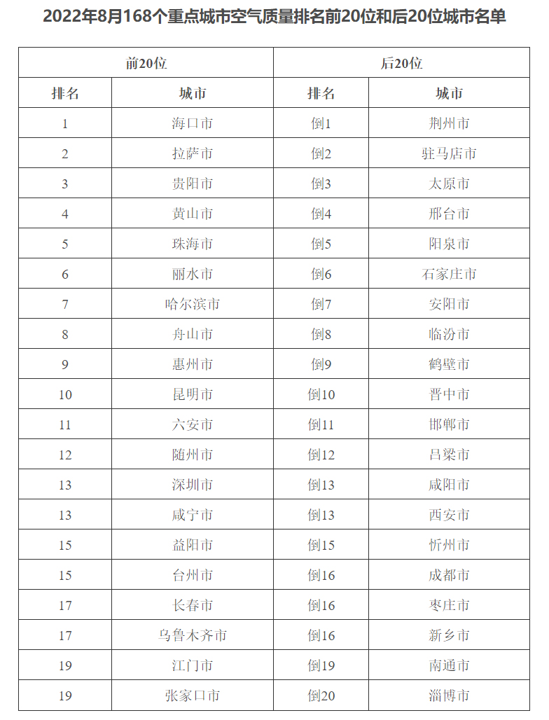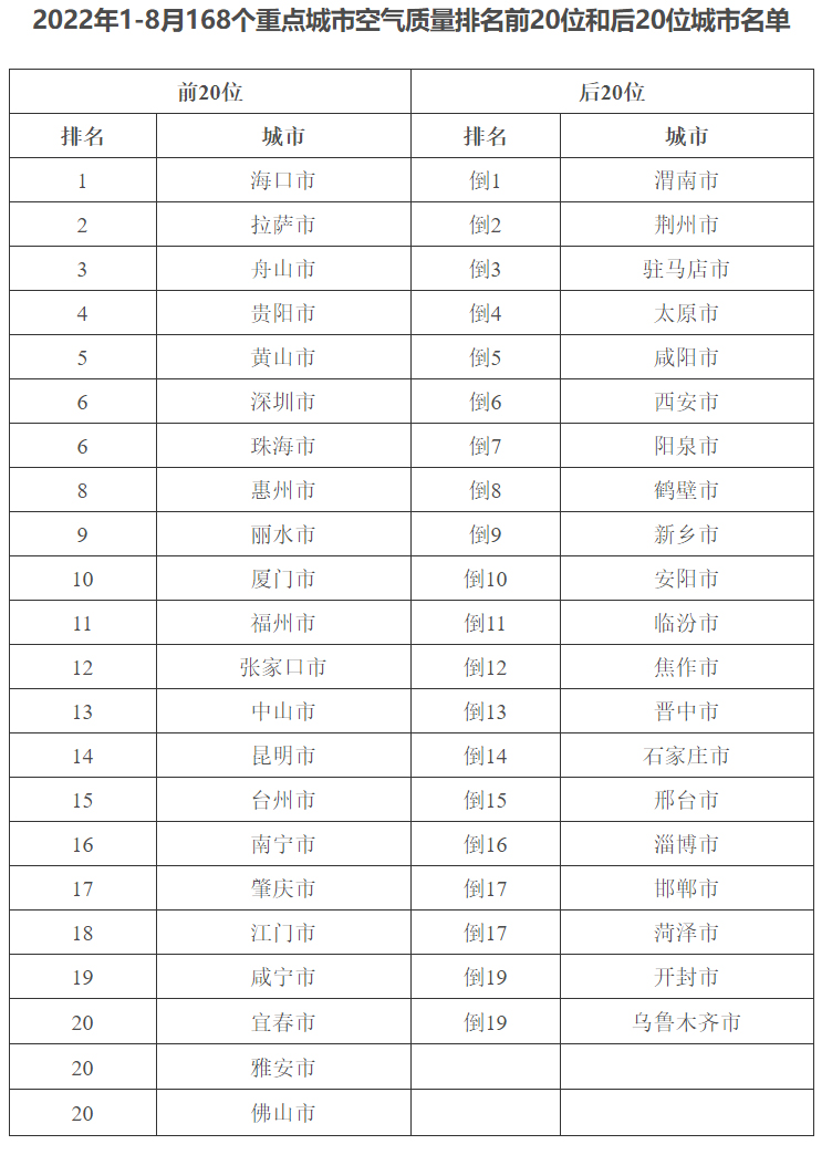 三、重点城市排名 8月,168个重点城市中,海口、拉萨、贵阳市等城市空气质量相对较好(从第1名至并列第19名);荆州、驻马店、太原市等城市空气质量相对较差(从倒数第1名至倒数第20名),见附表1。 1—8月,168个重点城市中,海口、拉萨、舟山市等城市空气质量相对较好(从第1名至并列第20名);渭南、荆州、驻马店市等城市空气质量相对较差(从倒数第1名至并列倒数第19名),见附表2。 附表1 ![]() 附表2