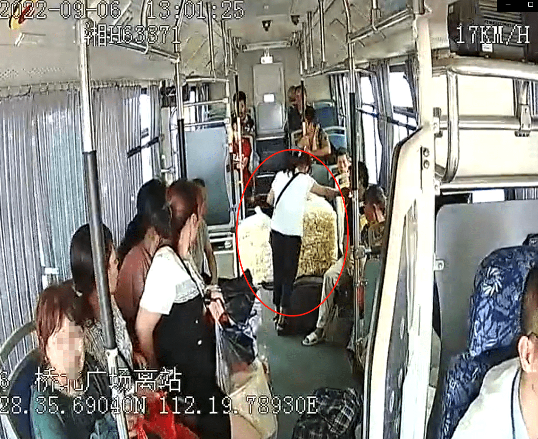 监控视频显示,9月6日13时许,桥北广场进站停车,一名大妈从公交车后门上车,将两大包塑料袋装的膨化零食泡泡杆一起搬上车,乘客上车后公交车继续行驶。大妈将物品摆放好后,走到公交车前方刷卡。