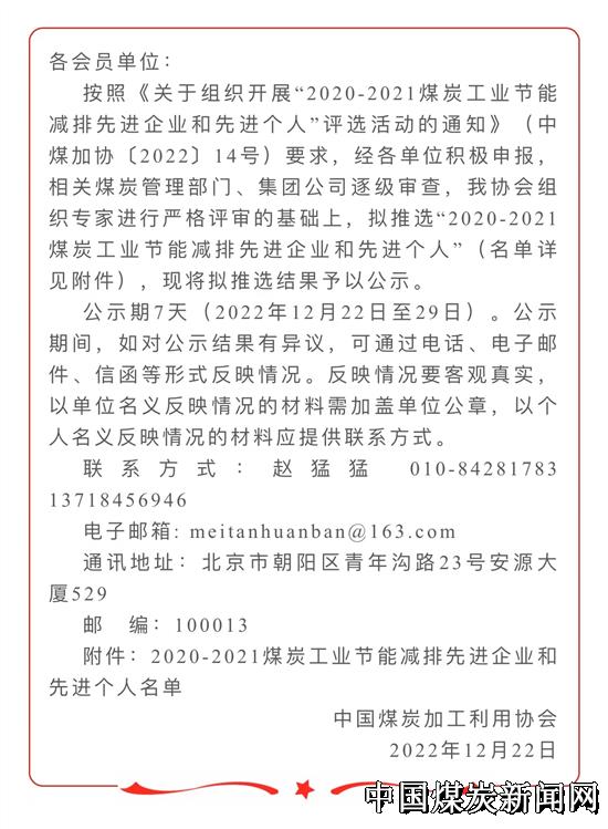 【本网讯】近日,中国煤炭加工利用协会发布《关于公示2020-2021年煤炭工业节能减排先进企业和先进个人的通知》,陕煤集团神木柠条塔矿业有限公司荣获“煤炭工业节能减排先进企业”荣誉称号。