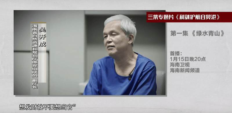 吴开成出镜忏悔。 2017年3月,吴开成作为海南省政府开展全省海岸带保护与开发专项检查整治回头看的第二检查组组长,带队赴万宁市检查日月湾冲浪基地建设项目。 吴开成发现,日月湾冲浪基地建设项目存在违法违规占用海岸带的事实,冲浪基地项目里有个别零星的小项目正在开工建设,部分青皮林遭到破坏。 然而就是这样一个破坏生态环境的违法建设项目,因为时任万宁市委书记张美文的辩解便被吴开成压下来放过去。既不责令万宁市政府进行纠正,也未将该问题向海南省政府报告,导致该违法建设项目继续施工。 2019年7月,万宁日月湾冲浪基地因侵占青皮林省级自然保护区,造成青皮林生存环境破碎化严重等问题,受到中央环保督察组通报。 在青皮林保护上不敢作为的吴开成此前已触及廉洁底线。专题片介绍,早在2013年负责矿产资源监管的吴开成便与私营企业主王某约定,由王某负责出资送给吴开成“干股”,吴开成充当“影子股东”,帮助王某办理采矿许可证,获得石场采矿权,干起了“靠矿吃矿”的勾当。 吴开成违反有关规定,将挂牌方式变更为招标出让方式,并利用职权向有关经办人员打招呼,帮助王某低价取得了三亚市吉阳镇罗蓬村石场的采矿权。因为该石场处于主干公路的可视范围内,无法办理环境评估和采矿许可证。 在吴开成直接运作下,王某的采矿权从三亚市罗蓬村石场置换到三亚市南新农场牛坡岭石场,并顺利办理了采矿许可证。2018年吴开成将王某所送的干股转让非法获利2000万元。 吴开成还存在其他严重违纪违法犯罪问题。2022年9月吴开成被开除党籍和公职,其涉嫌受贿犯罪问题被移送检察机关依法审查起诉。同时王某涉嫌违法犯罪问题被公安机关立案侦查。 吴开成在专题片中忏悔道:“感到很后悔,忘了总书记说想当官就不要想发财,想发财就不要想当官,又想当官又想发财,确实是自造牢笼、自掘坟墓”。 县领导与开发商共谋非法占地763余亩,旅游度假区成住宅区 2019年4月24日,中央电视台曝光了海南陵水县国贸•泥辽千亩违建,是一个五证俱无、严重破坏当地生态环境的项目。该项目始于2012年,由国贸公司以建设泥疗休闲养生旅游度假区为名立项,然而以旅游名义立项的“国贸•泥料”却改头换面建成了商品房。 截至2019年1月,以实际非法占地763余亩,违法建设11栋高层住宅,201栋别墅及1栋酒店等附属设施,违建总面积45万余平方米,其超高层建筑还阻断了天际线,遮挡了青山绿水,成为当地生态环境的一块伤疤。 专题片介绍,国贸·泥疗 违建项目之所以发生,与陵水县一些领导干部同不法开发商沆瀣一气,权钱交易有直接关系。 2012年国贸·泥疗 项目启动前期建设,国贸公司便向时任县国土环境资源局局长吴定国行贿230万元人民币和20万元港币,请求将该项目1100亩土地变性为建设用地,拿了好处费的吴定国不遗余力地帮助国贸公司办理土地变性手续。 2015年在收下国贸公司所送的50万元港币汇入后,时任陵水黎族自治县委原副书记、县人民政府原县长的杨文平不顾该项目没有取得环评手续,积极推动英州镇政府非法征地毁林占田,为国贸公司开辟违建施工面,甚至在全省全面推进整治违法建筑三年攻坚行动期间,杨文平还多次以县政府常务会专题会等方式,共越权批准国贸·泥疗项目征收集体土地432.7亩。