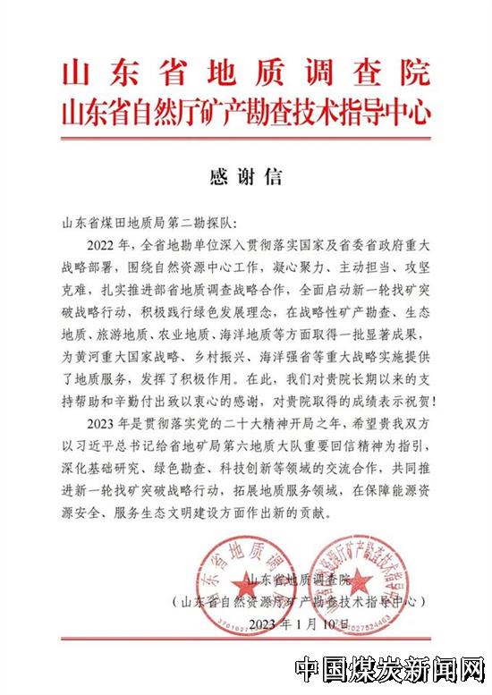 | 山东省煤田地质局第二勘探队收到省地质调查院和省自然厅矿产勘查技术指导衷心感谢信 | |||