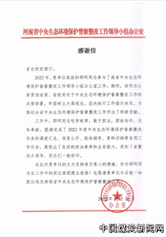 【本网讯】近日,河南省资源环境调查三院收到一封来自河南省中央生态环境保护督察整改工作领导小组办公室的感谢信,对河南省资源环境调查三院邵珂同志的优良作风和工作中的突出表现给予了高度赞扬。