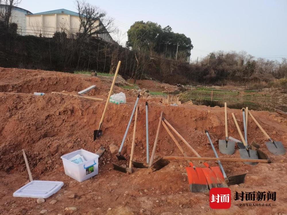 此前有报道称,知情人介绍在粮库院墙发现攀爬、翻越痕迹,胡鑫宇疑似踩踏着施工堆积的沙土翻越进入。记者逐段登上沙土顶部探查,发现旁边的粮库围墙最低处有三四米高,一些区段甚至有四五米高。沙土堆高低不同,但从顶部距离围墙顶部都有两米以上的距离,且沙土堆与围墙之间有杂树、荆棘。记者从落差最小的沙土堆处,攀着树枝试图爬上围墙查看,发现院墙内侧落差高达四五米,普通人无法跳跃下去。 在工地上,记者看到现场遗留着十几把铁锹、镢头等勘测工具,以及警戒线等物证提取所需的物品。
