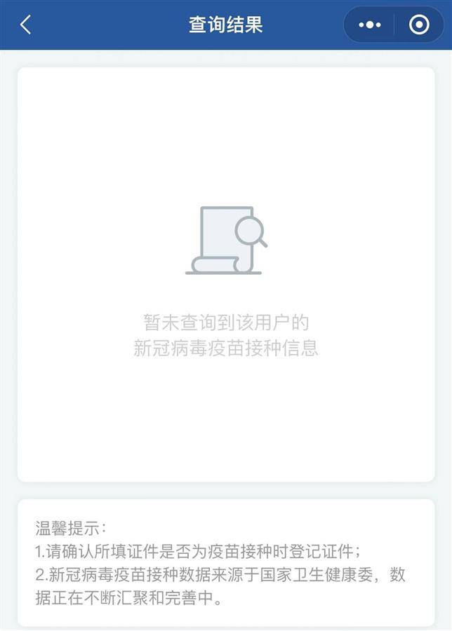 记者在国务院小程序上未能查询到接种信息(小程序截图) 在一款官方小程序上,极目新闻记者尝试使用杨某连相关信息查询疫苗接种情况,但并未查询到该用户的新冠病毒疫苗接种信息。 7日中午11时许,五台县疫情防控办工作人员告诉极目新闻记者,他们记录了上述信息,将会对此事进行调查。