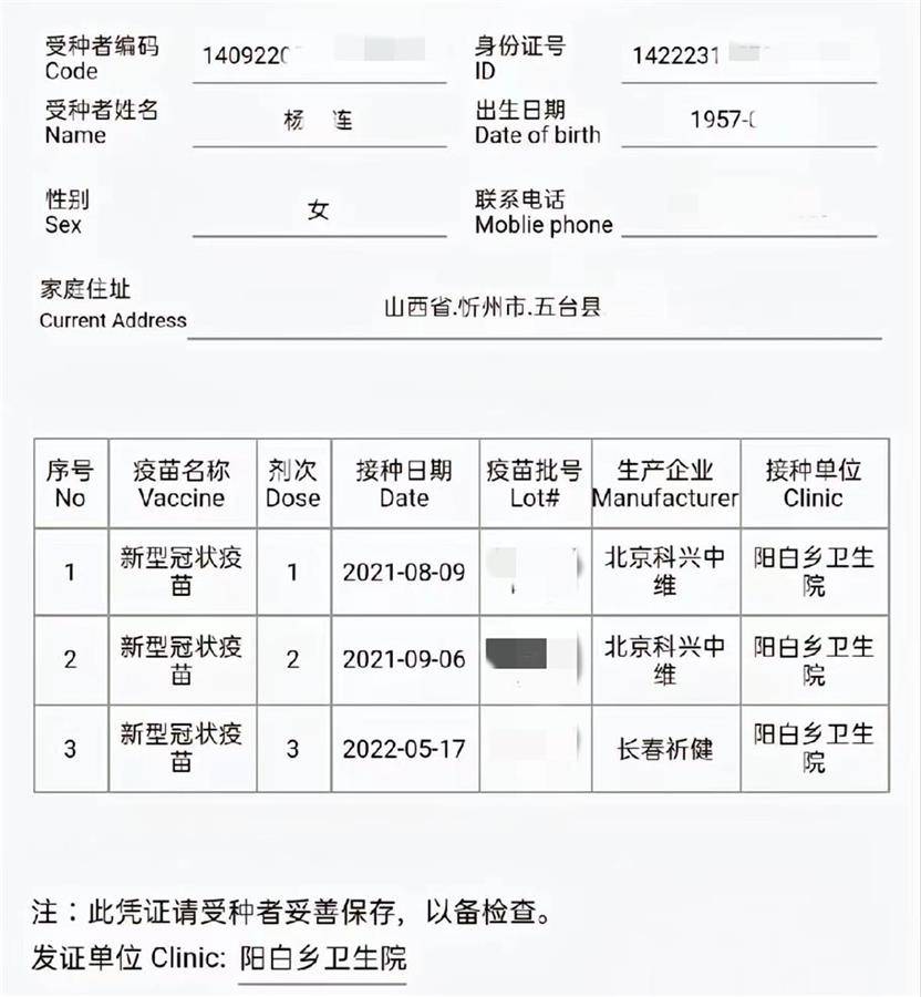 当事人称,自己母亲离世后还接种了三针疫苗(视频截图) 网友提供的预防接种凭证显示,受种者姓名杨某连,1957年出生。新型冠状病毒疫苗共接种三针,分别在2021年8月、2021年9月、2022年5月接种,接种单位均为阳白乡卫生院。
