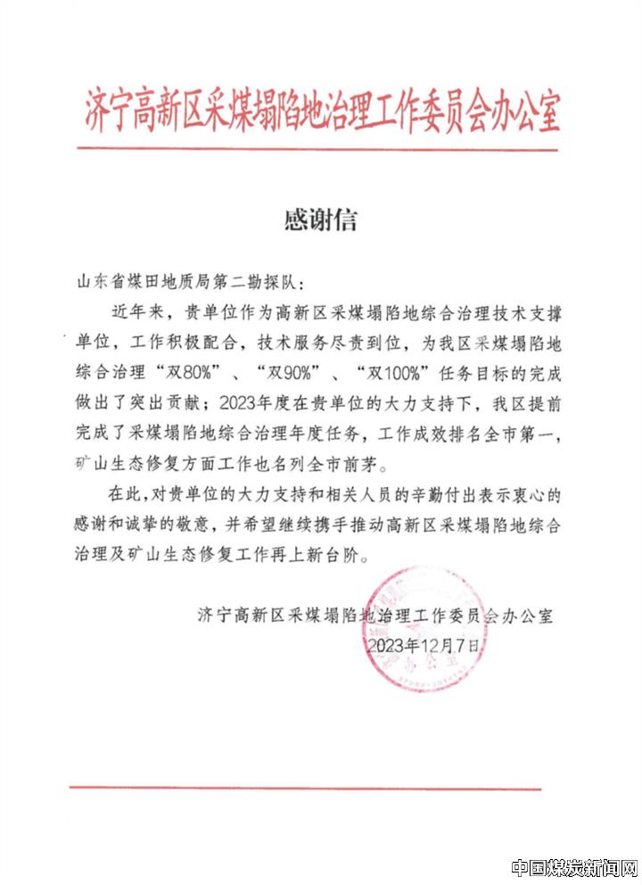 | 山东省煤田地质局二队收到济宁高新区采煤塌陷地治理工作委员会办公室感谢信 | |||