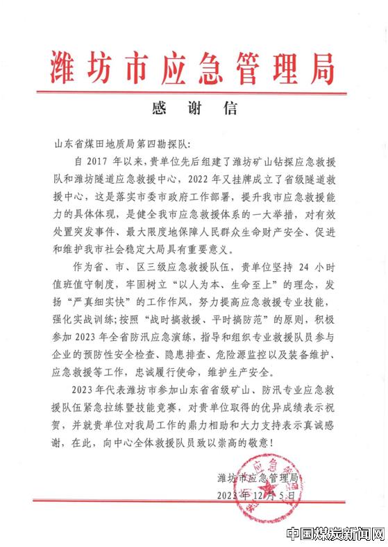 | 山东省煤田地质局四队收到潍坊市应急管理局感谢信 | |||