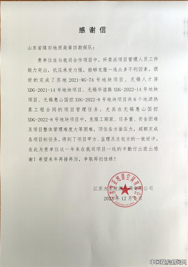 | 山东省煤田地质局四队收到长三角合作项目感谢信 | |||
