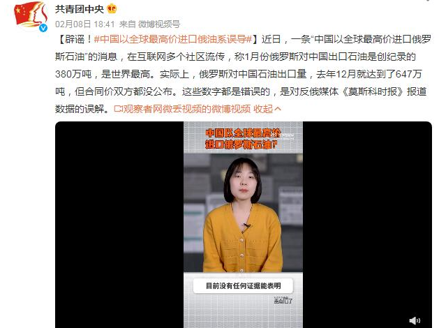 实际上,俄罗斯对中国石油出口量,去年12月就达到了647万吨,但合同价双方都没公布。 ![]() 作者 / 共青团中央 来源 / 共青团中央 近日,一条“中国以全球最高价进口俄罗斯石油”的消息,在互联网多个社区流传,称1月份俄罗斯对中国出口石油是创纪录的380万吨,是世界最高。实际上,俄罗斯对中国石油出口量,去年12月就达到了647万吨,但合同价双方都没公布。这些数字都是错误的,是对反俄媒体《莫斯科时报》报道数据的误解。 ![]() (图片来源:veer图库)