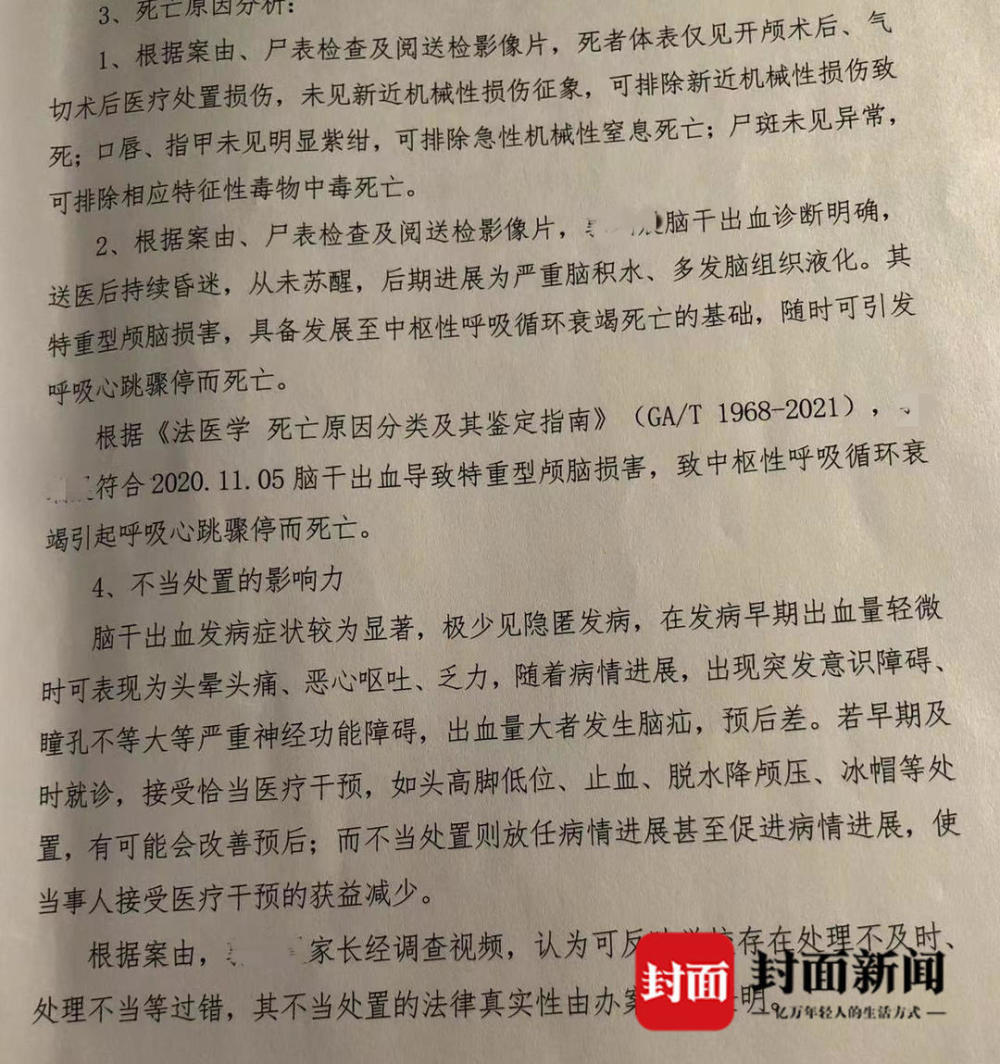 封面新闻记者 石伟 2月16日,郭丽(化名)再次发帖对儿子小晨的死亡质疑,她认为学校连续的疏忽导致小晨发病后未得到及时救治而死亡。 2020年11月5日,8岁的小晨在课堂上多次举手示意身体不舒服,但未得到及时处置。直到下课放学在楼梯间倒地,送医后诊断为脑干出血,救治280多天后死亡。 一审中,校方辩称小晨的几次举手是小孩子的挠头动作;老师询问他“快放学了,能否坚持一下,他点头表示可以”;老师并非专业医护人员,无法判断他会突发严重疾病。 “我不认可这种解释。课堂上不需要老师专业地判断孩子的病有多重,只需要你正常关注,积极处理。”郭丽说,遗憾的是学校被判定担责20%,赔偿2万元之后,校园内恢复如常,这起意外事件未对校园管理带来什么变化。 封面新闻记者多次联系校方三位校长、副校长,均未获得回应。 8岁男孩5次举手示意不舒服 “坚持到放学”后送医救治280天死亡 一审判决书中郭丽一方陈述称,2020年11月5日上午第三节课,小晨满头大汗地俯趴在桌上,多次举手向老师示意,直到第5次举手被班主任老师关注到,但老师未联系医务人员或家长,让小晨忍到课程结束。下课后,班主任把哭泣的小晨往楼下送,从监控明显可看出小孩走路不稳,在楼道拐角处重重摔倒,当场昏迷。此时,距离小晨第一次举手求救过去了36分钟。 事发后,小晨的父亲在校门等候时,听到同学提到“小晨摔倒昏迷快死了”,冲到现场拨打120并采取了急救措施。小晨被送医后救治280天后,于2021年8月出院,出院时处于神志昏迷状态。 2022年2月18日,郭瑞晨因呼吸心跳骤停死亡。司法鉴定显示,小晨符合2020年11月5日脑干出血导致特重型颅脑损害,致中枢性呼吸循环衰竭引起呼吸心跳骤停。