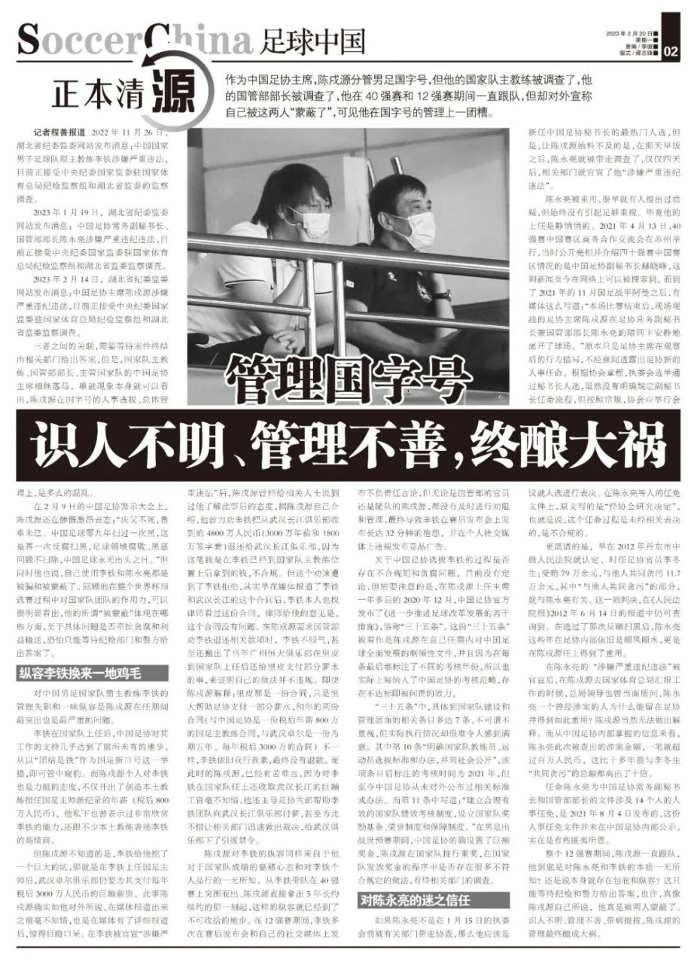 记者程善报道 2022年11月26日,湖北省纪委监委网站发布消息:中国国家男子足球队原主教练李铁涉嫌严重违法,目前正接受中央纪委国家监委驻国家体育总局纪检监察组和湖北省监委的监察调查。 2023年1月19日,湖北省纪委监委网站发布消息:中国足协常务副秘书长、国管部部长陈永亮涉嫌严重违纪违法,目前正接受中央纪委国家监委驻国家体育总局纪检监察组和湖北省监委监察调查。 2023年2月14日,湖北省纪委监委网站发布消息:中国足协主席陈戌源涉嫌严重违纪违法,目前正接受中央纪委国家监委驻国家体育总局纪检监察组和湖北省监委监察调查。 三者之间的关联,需要等待案件终结由相关部门给出答案,但是,国家队主教练、国管部部长、主管国家队的中国足协主席相继落马,单就现象本身就可以看出,陈戌源在国字号的人事选拔、总体管理上,是多么的混乱。 在2月9日的中国足协警示大会上,陈戌源还在慷慨激昂地表态:“庆父不死,鲁难未已。中国足球零九年扫过一次黑,这是再一次反腐扫黑,足球领域腐败、黑恶问题不扫除,中国足球永无出头之日。”但同时他也说,自己使用李铁和陈永亮都是被骗和被蒙蔽了。回顾他在整个世界杯预选赛过程中对国家队团队的作用力,可以很明显看出,他的所谓“被蒙蔽”体现在哪些方面,至于具体问题是否牵扯贪腐和利益输送,恐怕只能等待纪检部门和警方给出答案了。 对中国男足国家队前主教练李铁的管理失职和一味纵容是陈戌源在任期间最突出也是最严重的问题。 李铁在国家队上任后,中国足协对其工作的支持几乎达到了前所未有的地步,从以“团结是铁”作为国足新口号这一举措,即可管中窥豹。而陈戌源个人对李铁也是力挺的态度,不仅开出了创造本土教练担任国足主帅新纪录的年薪(税后800万人民币),他私下也曾表示过非常欣赏李铁的能力,还跟不少本土教练表扬李铁的高情商。 但陈戌源不知道的是,李铁给他挖了一个巨大的坑,那就是在李铁上任国足主帅后,武汉卓尔俱乐部仍要为其支付每年税后3000万人民币的巨额薪资。此事陈戌源确实如他对外所说,在媒体报道出来之前毫不知情,也是在媒体有了详细报道后,惊得目瞪口呆。 在李铁被官宣“涉嫌严重违法”后,陈戌源曾经给相关人士说到过他了解此事后的态度,据陈戌源自己介绍,他曾力劝李铁把从武汉长江俱乐部收到的4800万人民币(3000万年薪和1800万签字费)退还给武汉长江俱乐部,因为这笔钱是在李铁已经到国家队主教练位置上后拿到的钱,不合规。但这个劝谏遭到了李铁拒绝,其实早在媒体报道了李铁和武汉长江的这个合同后,李铁本人也找律师看过这份合同,律师给他的意见是,这个合同没有问题。 在陈戌源要求国管部劝李铁退还相关款项时,李铁不服气,甚至还搬出了当年广州恒大俱乐部在里皮到国家队上任后还给里皮支付部分薪水的事,来证明自己的做法并不违规。即使陈戌源解释:里皮那是一份合同,只是恒大帮助足协支付一部分薪水,和你的两份合同(与中国足协是一份税后年薪800万的国足主教练合同,与武汉卓尔是一份为期五年、每年税后3000万的合同)不一样,李铁依旧我行我素,最终没有退款。 而此时的陈戌源,已经有苦难言,因为对李铁在国家队任上还收取武汉长江的巨额工资毫不知情,他还主导足协内部帮助李铁团队向武汉长江俱乐部讨薪,甚至为此不惜让相关部门迅速做出裁决,给武汉俱乐部下了引援禁令。 陈戌源对李铁的纵容同样来自他对于国家队成绩的豪赌心态和对李铁个人品行的一无所知。从李铁带队在40强赛上突围而出、陈戌源直接拿出5年长约续约的那一刻起,这样的纵容就已经到了不可收拾的地步。在12强赛期间,李铁多次在赛后发布会和自己的社交媒体上发布不负责任言论,但无论是国管部的官员还是随队的陈戌源,都没有及时进行劝阻和管理,最终导致李铁在赛后发布会上发布长达32分钟的抱怨,并在个人社交媒体上违规发布竞品广告。 关于中国足协选拔李铁的过程是否存在不合规矩和贪腐问题,目前没有定论,但需要注意的是,在陈戌源上任主席一年多后的2020年12月,中国足协官方发布了《进一步推进足球改革发展的若干措施》,俗称“三十五条”。这份“三十五条”被看作是陈戌源在自己任期内对中国足球全面发展的纲领性文件,并且因为在每条最后都标注了不同的考核年份,所以也实际上被纳入了中国足协的考核范畴,存在不达标即被问责的效力。 “三十五条”中,具体到国家队建设和管理层面的相关条目多达7条,不可谓不重视,但实际执行情况却很难令人感到满意。其中第10条“明确国家队教练员、运动员选拔标准和办法,并向社会公开”,该项条目后标注的考核时间为2021年,但至今中国足协从未对外公布过相关标准或办法。而第11条中写道:“建立合理有效的国家队绩效考核制度,设立国家队奖励基金、荣誉制度和保障制度。” 在男足出战世预赛期间,中国足协的确设置了巨额奖金,陈戌源在国家队推行重奖,在国家队发放奖金的程序中是否存在很多不符合规定的做法,有待相关部门的调查。 如果陈永亮不是在1月15日的执委会前被有关部门带走协查,那么他应该是新任中国足协秘书长的最热门人选,但是,让陈戌源始料不及的是,在那天早饭之后,陈永亮就被带走调查了,仅仅四天后,相关部门就官宣了他“涉嫌严