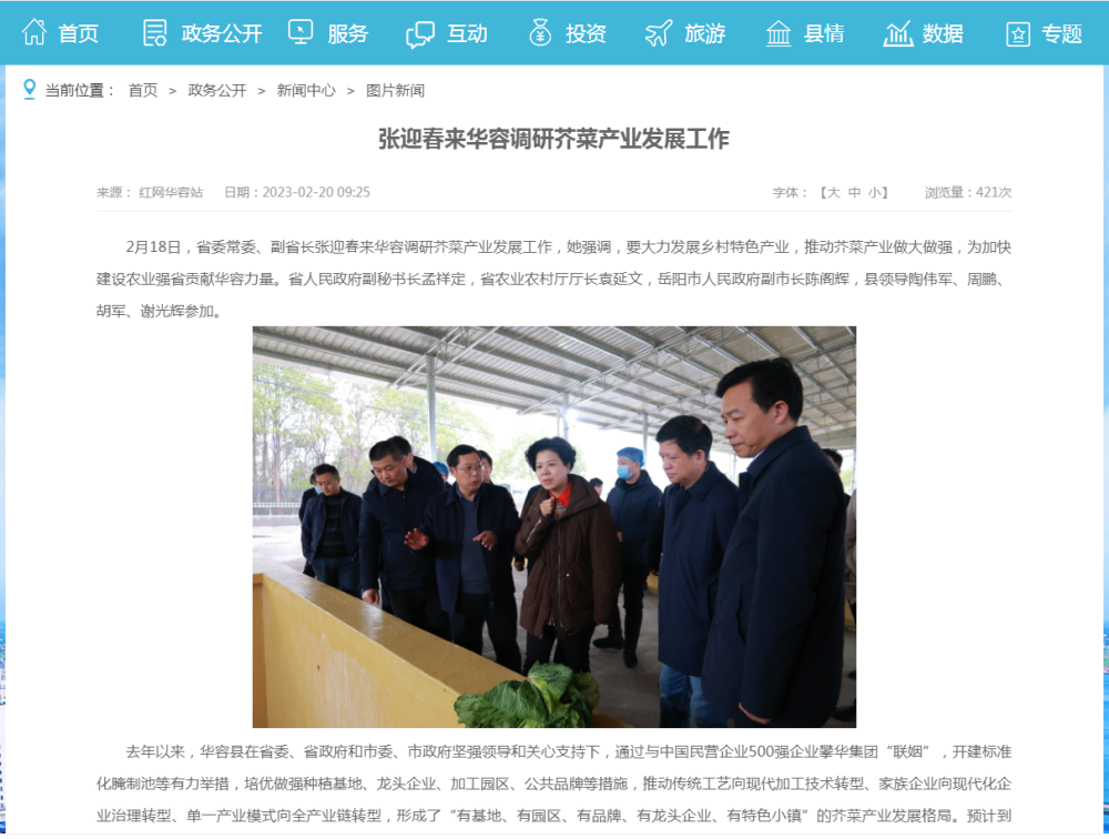 岳阳市华容县种植芥菜已有千年,被誉为“中国芥菜之乡”,尤以插旗镇、三峰寺镇周边乡镇为甚。华容芥菜腌制成酸菜后,搭配烹饪出的“酸菜鱼”“酸菜面”等菜品深受欢迎。 去年“土坑酸菜”被央视曝光 2022年3月,一场“土坑酸菜”风波突发。 据央视报道,一家名为“插旗菜业”的公司从外面收购“土坑酸菜”,充作老坛酸菜包里的酸菜。在曝光的视频画面中,酸菜在肮脏的土坑中腌制,工人抽着烟,脚踩在酸菜上加工装袋。 事件发生后,当地连夜宣布从即日起,对全县酱腌菜行业开展地毯式排查,后有华容县、君山区4名干部被停职或者免职。而芥菜产业工厂停产、鲜菜滞销、产品下架,如同雪崩。 至于插旗菜业,该公司及责任人共被罚款548万余元。今年2月,法定代表人严钦武、监事谢政熙退出公司全部股权。据当地媒体报道,此事还引起了省委书记张庆伟的关注。他就事件处置和加强行业监管等,先后作了10多次批示。 在2022年8月举行的“中国这十年•湖南”主题新闻发布会上,张庆伟说,县域经济的本质是民营经济,岳阳华容的酸菜加工业要加大扶持力度,加快技术改造,市场前景大有可为。 “我就这个事批了多次,一定要保住这个产业。”张庆伟还为华容芥菜打call,“一个月不吃老坛酸菜方便面吧,我就想着吃一口。” 副省长:推动芥菜产业做大做强 据华容县人民政府官网2月20日援引红网报道,2月18日,湖南省委常委、副省长张迎春来华容调研芥菜产业发展工作,她强调,要大力发展乡村特色产业,推动芥菜产业做大做强,为加快建设农业强省贡献华容力量。 张迎春先后来到湖南开口爽食品有限公司、三封寺镇辅安村标准腌制池现场调研企业发展、芥菜加工、品牌建设等情况,并深入新河乡华丰村,与种植大户、合作社负责人亲切攀谈,了解生产管理、规模收益等情况。她强调,要全面学习,全面把握,全面落实党的二十大精神,大力发展乡村特色产业,拓宽农民增收致富渠道;要强化全流程监管,加强科技创新,进一步提升标准化规范化水平,放大品牌效应,推动芥菜产业做大做强。 报道指出,去年以来,华容县在省委、省政府和市委、市政府坚强领导和关心支持下,通过与中国民营企业500强企业攀华集团“联姻”,开建标准化腌制池等有力举措,培优做强种植基地、龙头企业、加工园区、公共品牌等措施,推动传统工艺向现代加工技术转型、家族企业向现代化企业治理转型、单一产业模式向全产业链转型,形成了“有基地、有园区、有品牌、有龙头企业、有特色小镇”的芥菜产业发展格局。预计到2024年,芥菜种植面积将保持在20万亩以上,年加工能力达到40万吨以上,芥菜产业总产值达到100亿元。 每日经济新闻综合湖南日报、红网、央视