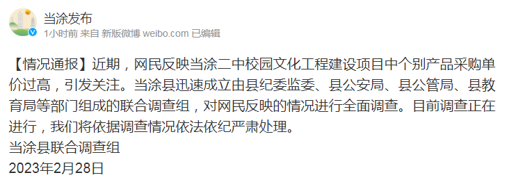 2月28日,据@当涂发布 发布通报称,近期,网民反映当涂二中校园文化工程建设项目中个别产品采购单价过高,引发关注。当涂县迅速成立由县纪委监委、县公安局、县公管局、县教育局等部门组成的联合调查组,对网民反映的情况进行全面调查。目前调查正在进行中,我们将依据调查情况依法依纪严肃处理。