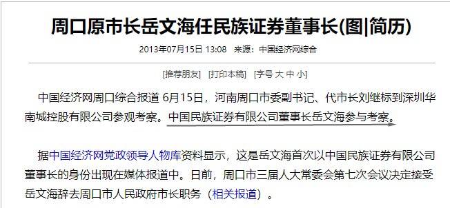 网络截图 上述两则信息似乎告诉人们,辞去市长职务后,岳文海进入中国民族证券有限责任公司工作,职务是党委书记、董事长。那么,这些信息是真实的吗? 2月2日,大皖新闻记者查询发现,中国民族证券有限责任公司2019年11月已更名为某证券承销保荐有限责任公司,该公司位于北京。记者随后翻看了该公司网站2013年至2023年发布的公司动态信息,找到的最早的一条出现“岳文海”的信息发布于2015年2月,当时他的职务是“党委书记”,当时他作为公司领导班子成员,在春节后上班第一天向员工拜年送祝福。该公司网站上最后一条提到岳文海的信息发布于2020年1月,当时他的职务仍是“党委书记”,在河南新县参加2020年帮扶工作推进座谈会。 大皖新闻记者注意到,该公司公开发布的提到岳文海的信息中,他的职务还包括公司“扶贫工作领导小组组长”,但记者未看到该公司网站发布的信息称岳文海为董事长。