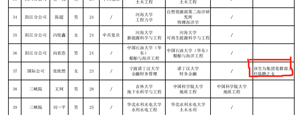在公示表中,该集团国际公司招聘人员张欣然的公示信息中,专门备注“该生为集团党群部主任陈静之女”。