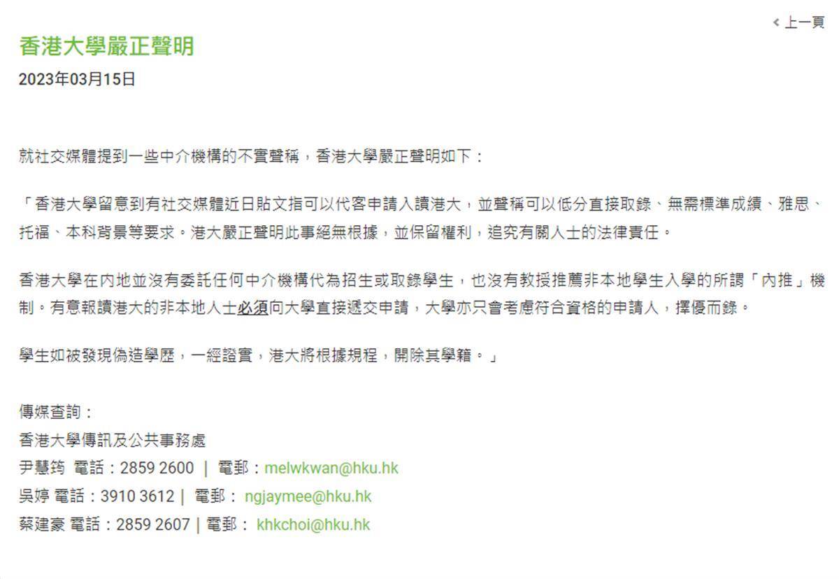 香港大学声明截图 3月15日,香港大学教务处入学事务部发声明称,留意到有社交媒体近日贴文指可以代客申请港大本科或硕士课程,并指可以低分直接录取、无标准成绩、无雅思、托福、本科背景等要求。港大严正声明此事绝无可能,并保留权利,追究有关人士的法律责任。 声明还称,香港大学在内地并没有委托任何中介机构代为招生或录取学生,也没有教授推荐非本地学生入学的所谓“内推”机制。有意报读港大的非本地人士必须向大学直接递交申请,大学亦只会考虑符合资格的申请人,择优而录。根据港大规程,如学生被发现伪造学历,必定会作出纪律处分,甚至被开除学籍。 同时,有律师指出,伪造学历报考大学可被控串谋诈骗,呼吁学生勿以身试法。