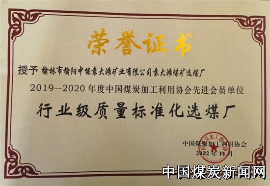 【本网讯】3月15日,在“2019-2020年度中国煤炭加工利用协会先进会员、先进个人”表彰会上,陕西中能袁大滩选煤厂荣获“2019-2020年度行业级质量标准化选煤厂”荣誉称号。