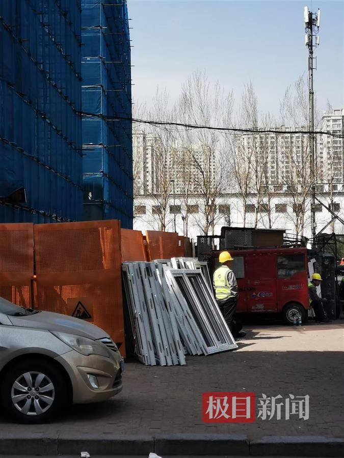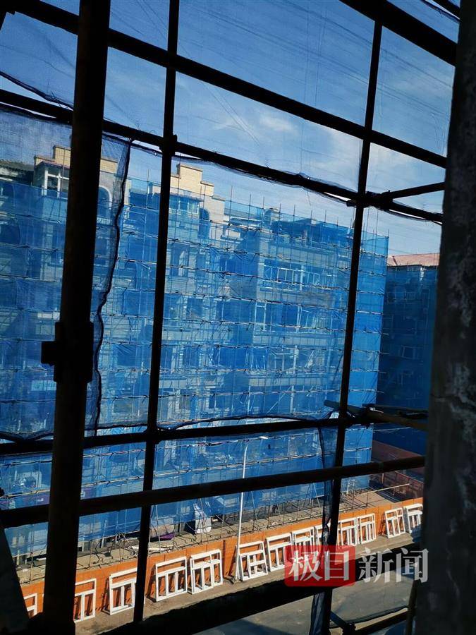 发生爆炸的11号楼已被纱网罩住 透过纱网,可以看见不少窗框和阳台框变形,玻璃破损。楼上楼下均有戴着安全帽的工人师傅在进行拆除破损窗户、变形阳台、更换窗户等工作。