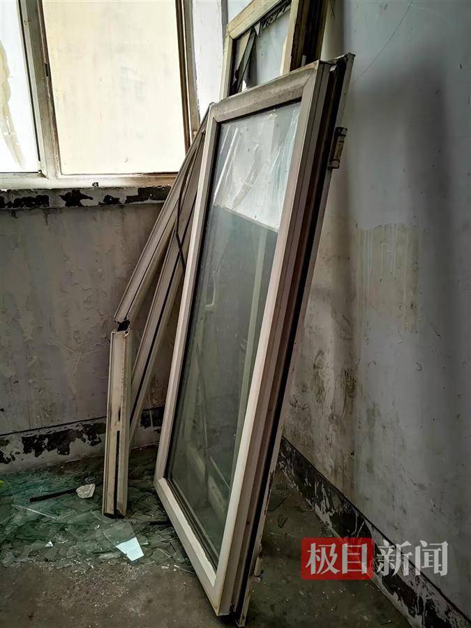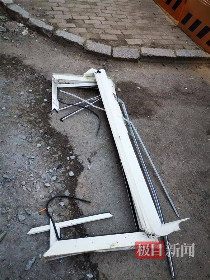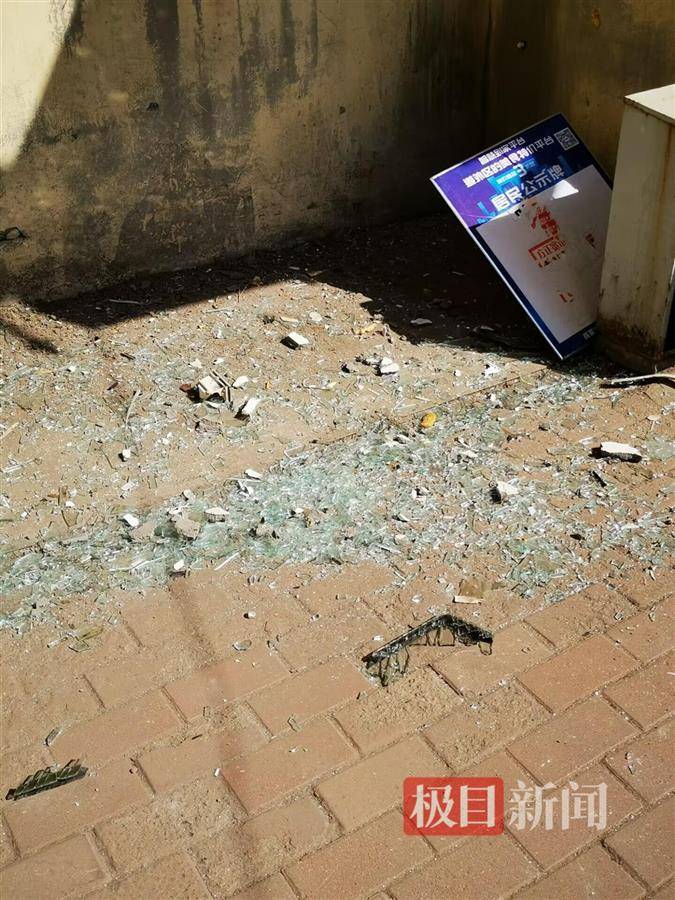 楼道内的玻璃碎片 在事发楼栋旁的空地上,还有不少没有完全清理干净的碎玻璃、受损窗户等物品。