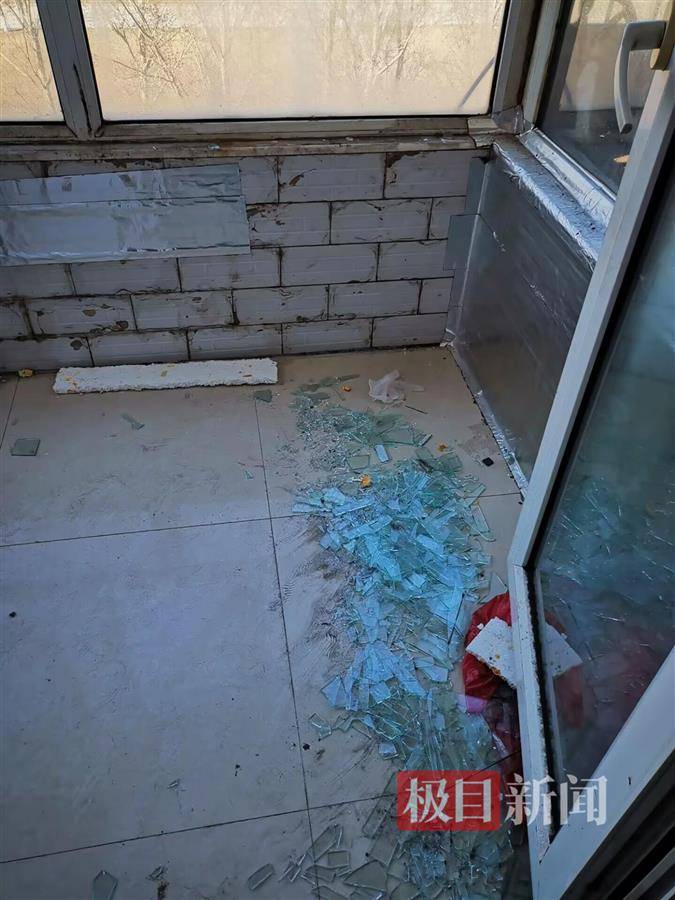 爆炸现场附近地上的玻璃碎片 在该小区A区4号楼6楼一户居民家,极目新闻记者看到,阳台上满是碎玻璃渣,窗户略微变形。通过其卧室的窗户和外面的蓝色纱网,可以看到对面的11号楼,有工人正在更换窗户框。该户居民称,爆炸发生时家里没有人,所以没有人受伤,目前在其它房子居住。
