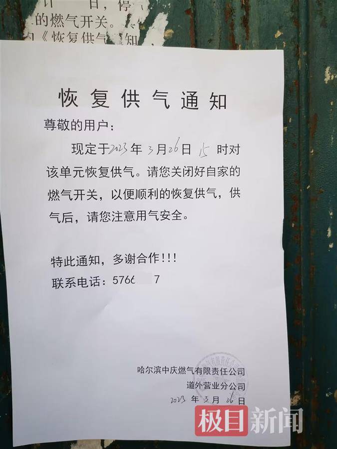 发生爆炸的11号楼已被纱网罩住 在11号楼3单元楼到7单元楼门口,均张贴着哈尔滨市中庆燃气有限责任公司道外营业分公司发布的恢复供气通知,称3月26日恢复供气。