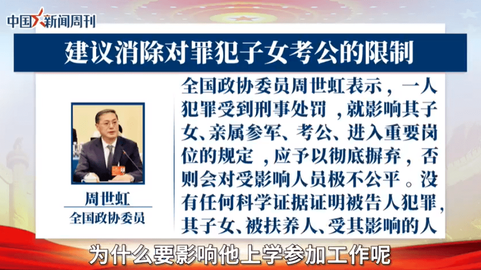 “罪责自负,不能把人一棍子打死” 澎湃新闻报道称,周世虹委员终于把之前在民间传得沸沸扬扬,但一直没有明确宣示规则的“一人犯罪,影响三代”的问题,摆放在了全国两会这个国家议事平台之上。事实上,我国参军、公考、考编的政审规则,其实一直没有公开的宣示,而且公职岗位千差万别,不同单位掌握的政审标准也不尽一致。