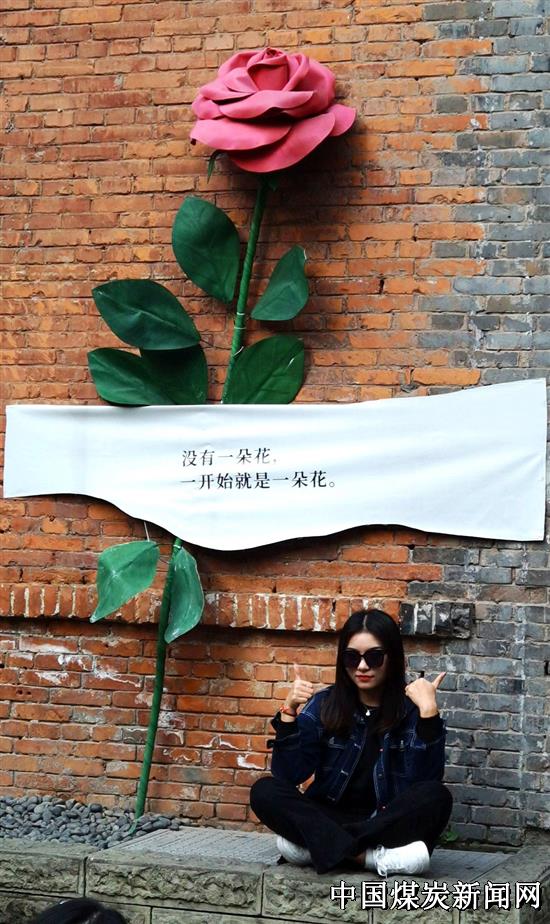 有姑娘们在这支花下打卡留影,但我观察,她们多是只注意了花,反而忽略了这幅字,肆意地用娇美的身姿挡住了字体,我想设计这景致的人看了一定会非常失望。直到一个女孩坐在花枝下拍照,亮出整幅字来,我赶紧抓拍了下来: