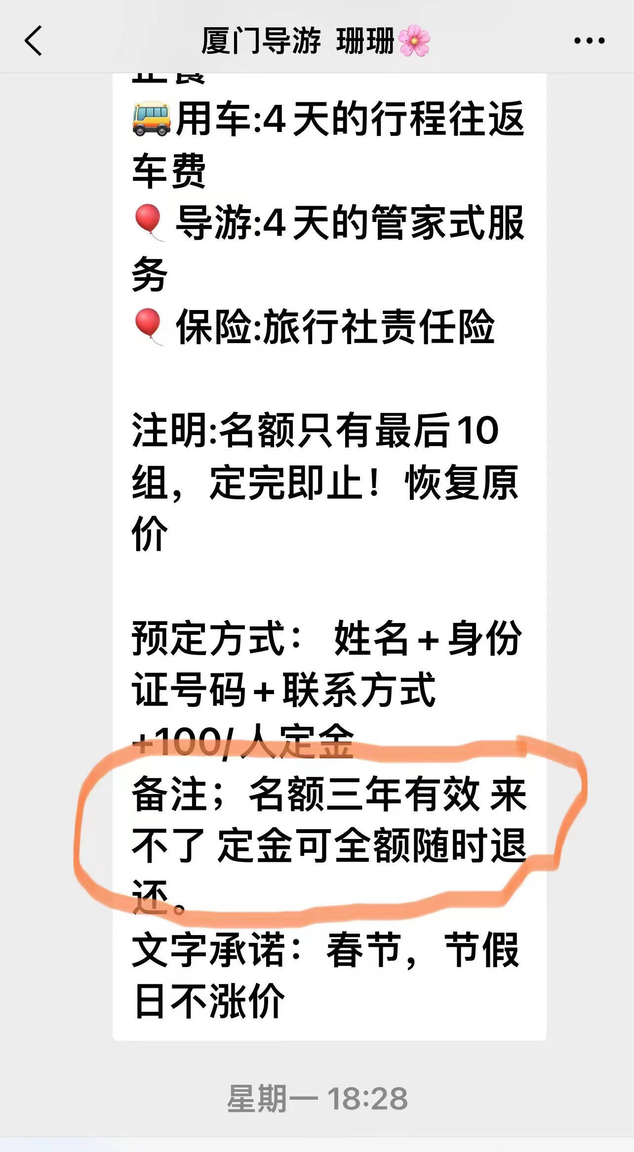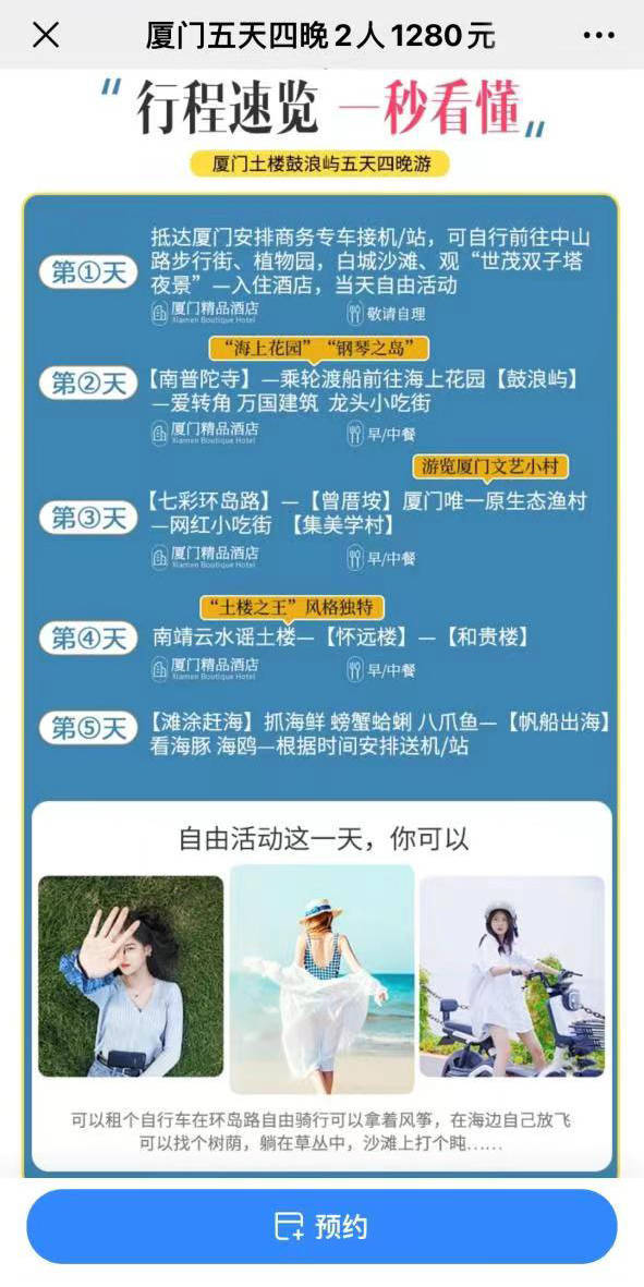 该公司的旅游项目广告 吴先生此前了解到,类似的旅游项目价位多在2000元左右,因此他怀疑该项目是强制消费的“低价团”。对方业务员表示不是“低价团”,称价格低是因为厦门市政府为恢复旅游市场提供了公共补贴。 澎湃新闻检索发现,厦门文旅局在2023年1月18日发布的《厦门市文化和旅游局关于促进文旅市场加快复苏若干措施的通知》中提到,“鼓励招徕游客。对旅行社2023年1月至3月组织游客在厦旅游,并在限额以上宾馆饭店过夜的,按照住宿费每晚50元/间的标准给予奖励,每间奖励最多不超过5晚,单个旅行社奖励最高不超过100万元。”