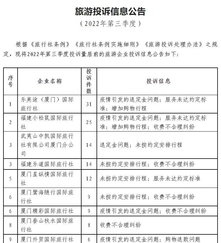 厦门市文化市场综合执法支队发布的第三、四季度的旅游投诉信息公告 工商信息显示,武夷山市中凯国旅厦门分公司成立于2013年,总公司武夷山市中凯国旅成立于2012年,注册资本为30万元。厦门市文化市场综合执法支队发布的旅游投诉信息公告显示,该公司2022年第三、四季度共被投诉20次,多与退定金问题有关。